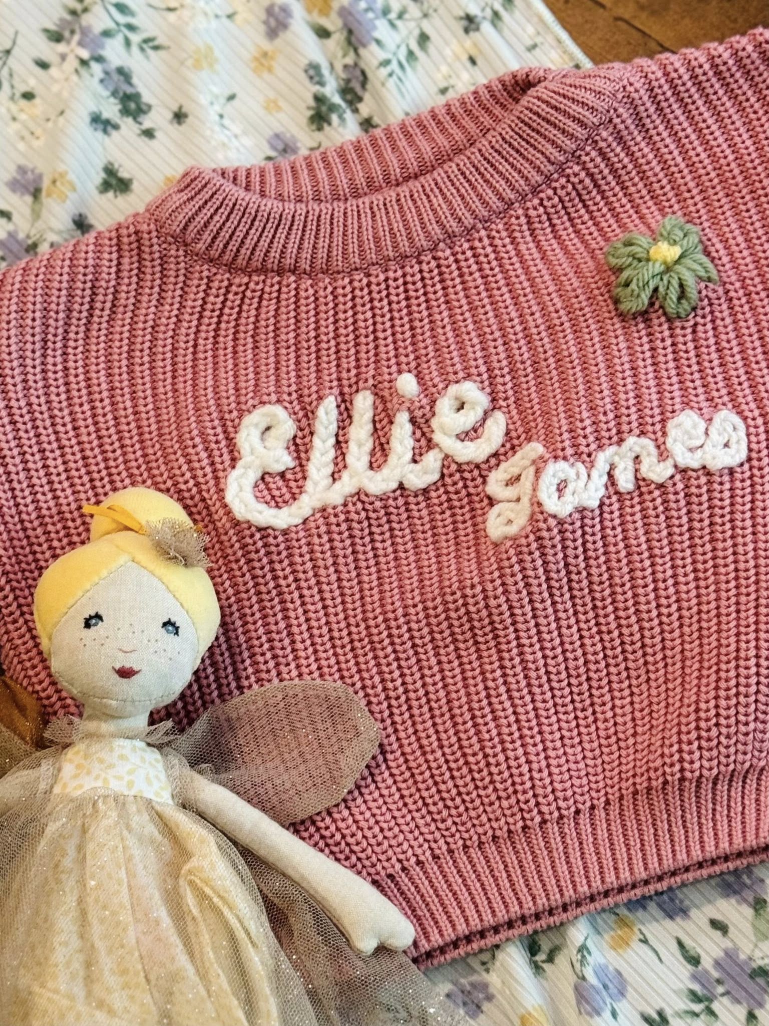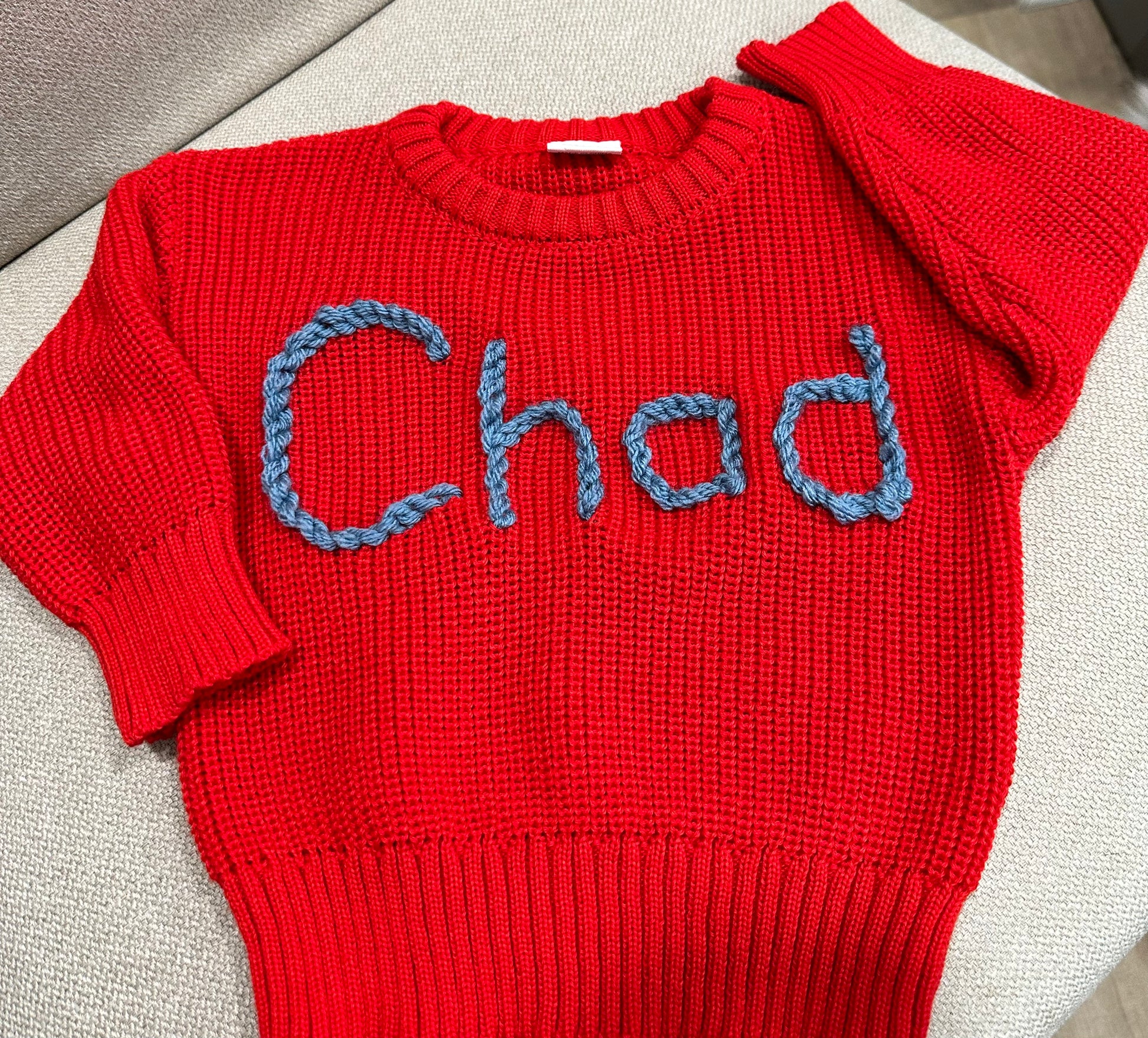 Please provide color of sweater and color of yarn for name. Also please provide if prefer cursive or print writing for the name. I will send you a mock up of the name for approval before preparing sweater. Turn around time is 2 weeks from time of order. Payment is due upon ordering. Venmo or PayPal are accepted.